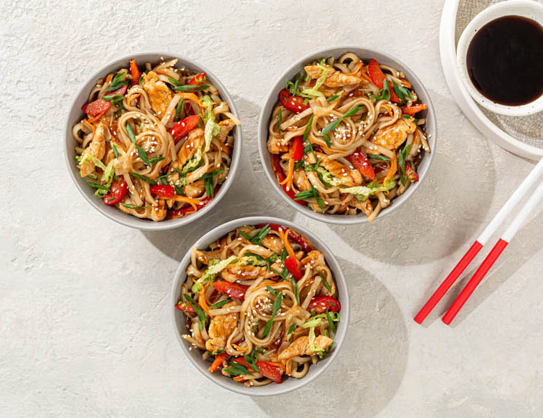 Лапша удон, терияки-соус, филе цыпленка, капуста, морковь, перец болгарский, лук репчатый, чеснок (3 порции)