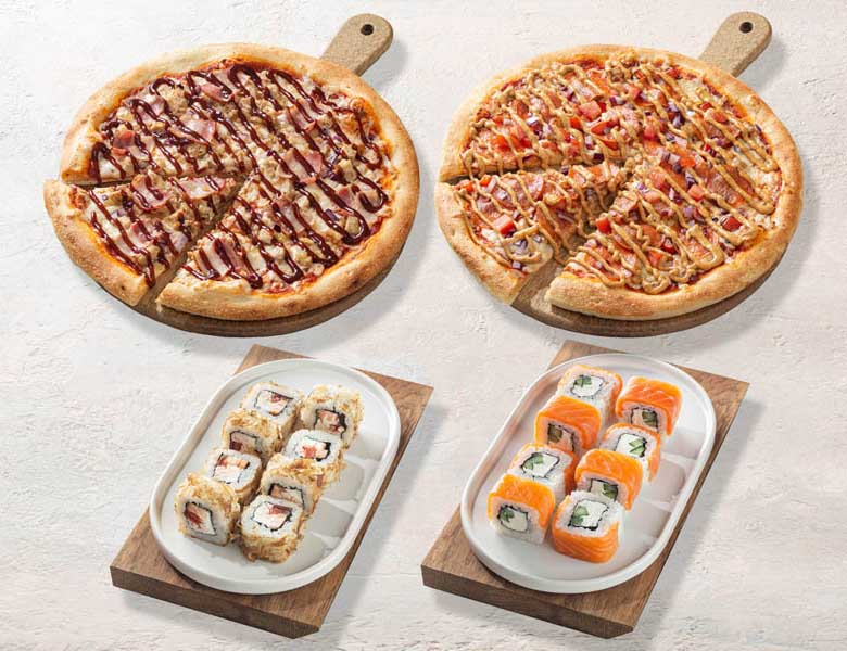 Пицца Чикен BBQ (30 см), Пицца Фьюжн (30 см), Ролл Фуджи, Ролл Филадельфия.