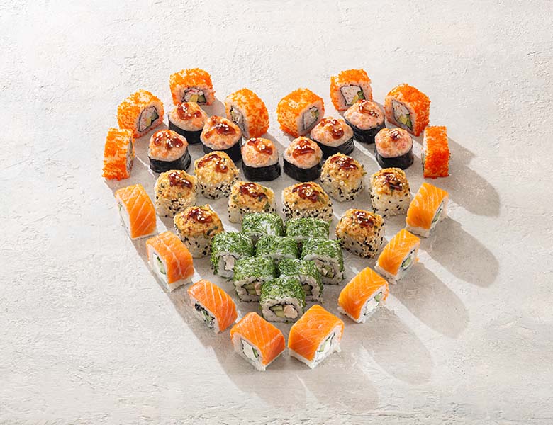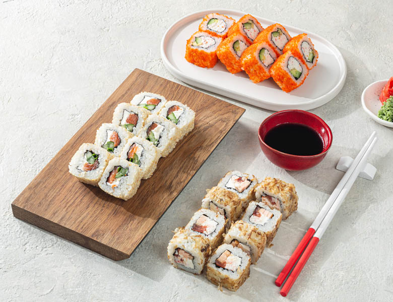 Калифорния (рис, водоросли нори, авокадо, огурец, снежный краб, икра летучей рыбы), Калифорния с кунжутом (краб-крем, свежий огурец, шеф-соус, кунжут), Фуджи (томат, краб...